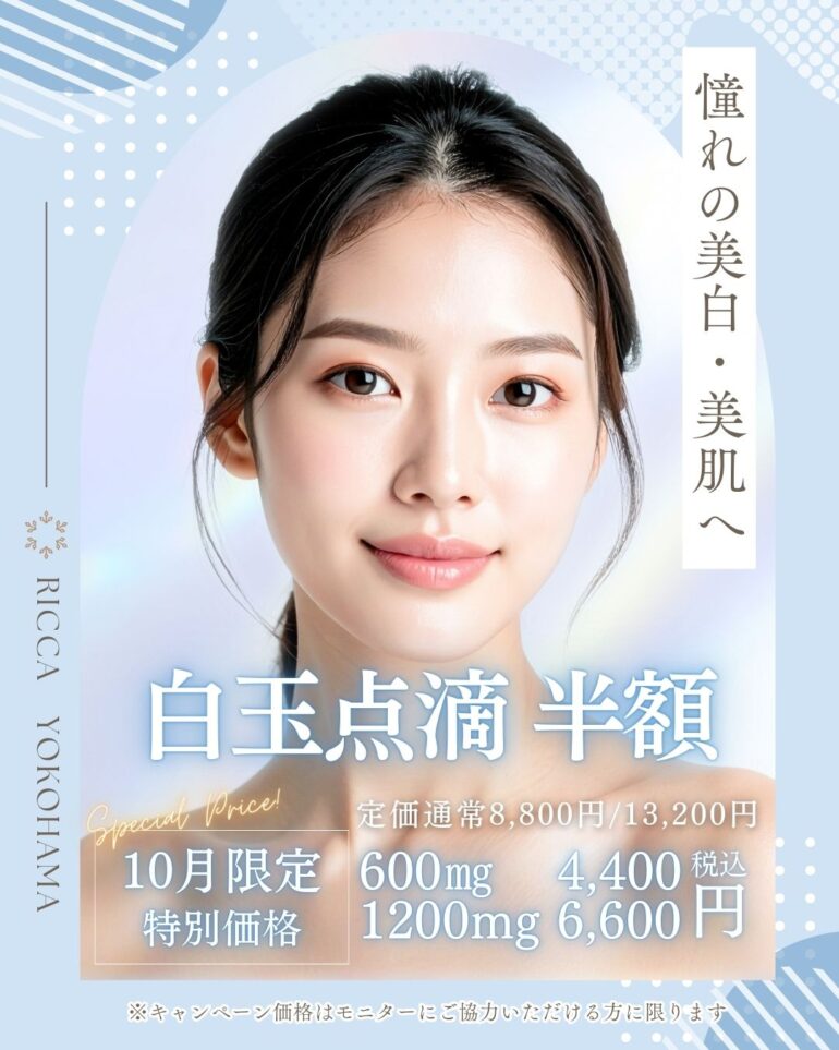 話題の白玉グルタチオン配合の白玉点滴が半額です。グルタチオンが皮膚のメラニン色素を排出し、肌のターンオーバーを正常化し、身体の内側からシミ・そばかす・くすみを改善します。夏の日焼けが気になる方もぜひお試しください。